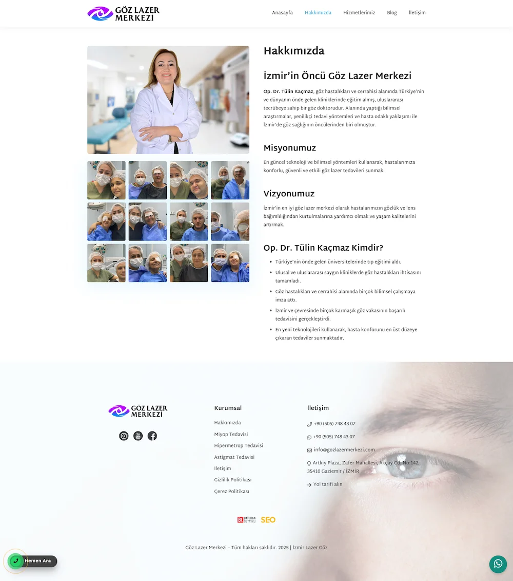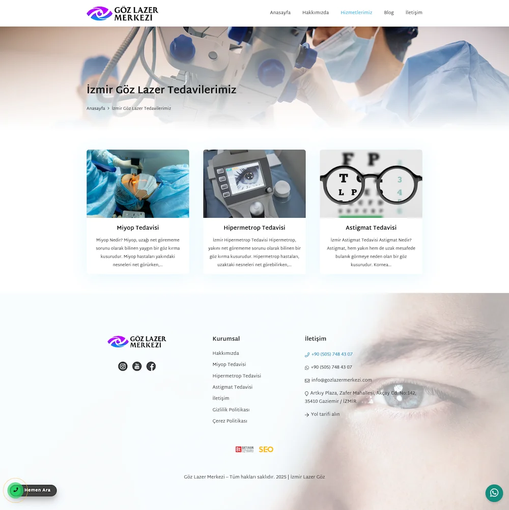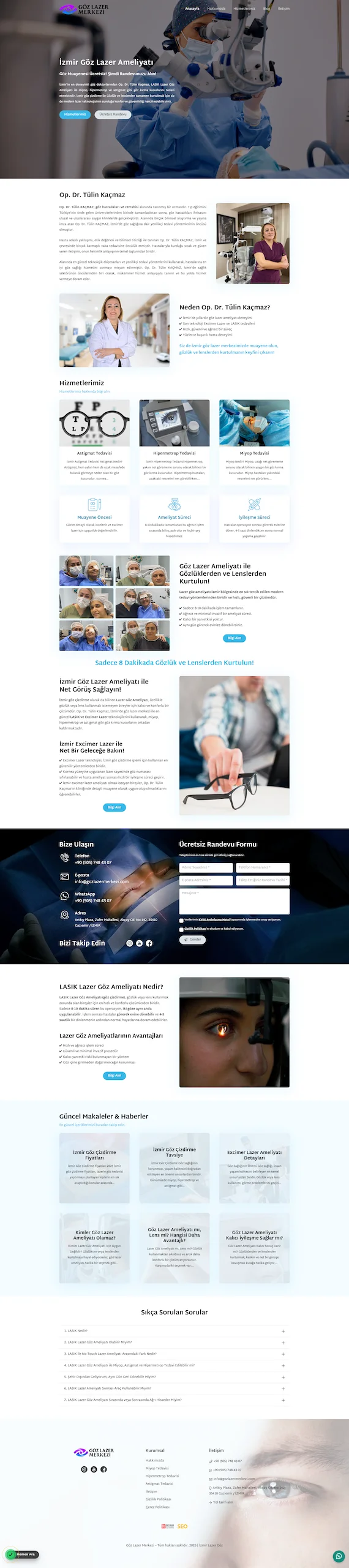 İzmir’in en deneyimli göz doktorlarından Op. Dr. Tülin Kaçmaz, Lasik Lazer Göz Ameliyatı ile miyop, hipermetrop ve astigmat gibi göz kırma kusurlarını tedavi etmektedir. Op. Dr. Tülin Kaçmaz İzmir Göz Lazer Merkezi’nin web tasarım çalışmasını tamamladık.