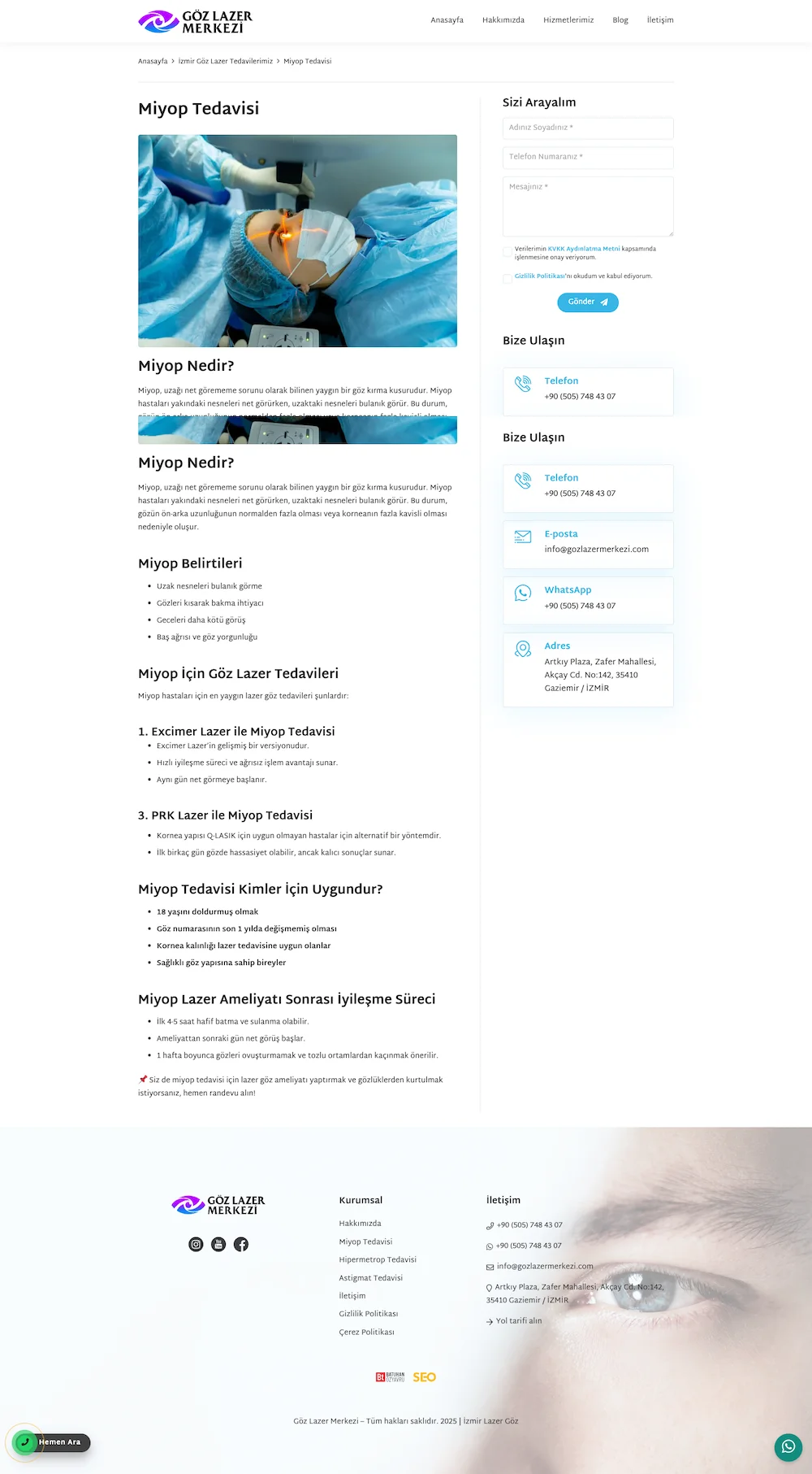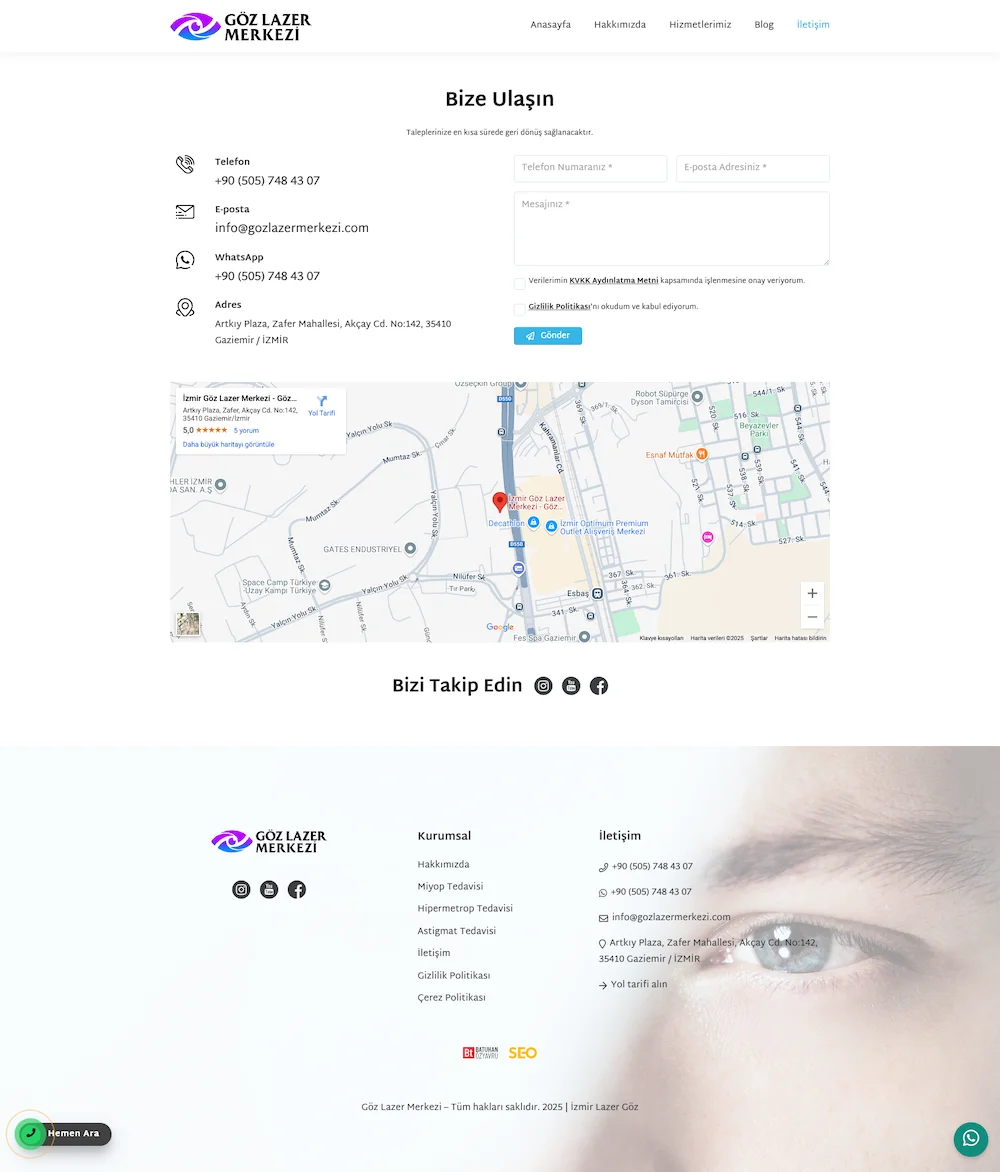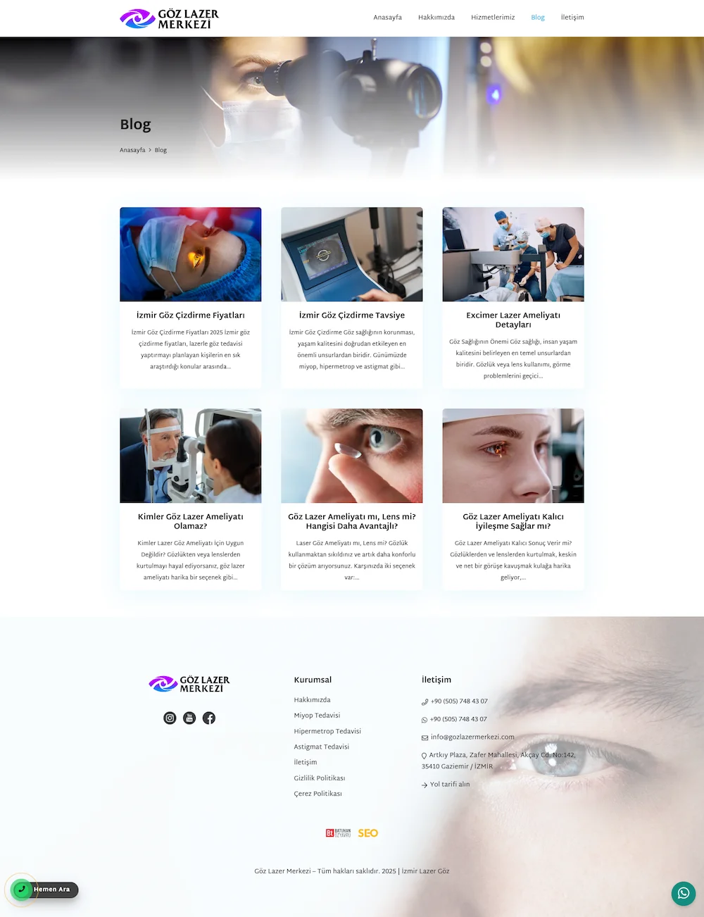 İzmir’in en deneyimli göz doktorlarından Op. Dr. Tülin Kaçmaz, Lasik Lazer Göz Ameliyatı ile miyop, hipermetrop ve astigmat gibi göz kırma kusurlarını tedavi etmektedir. Op. Dr. Tülin Kaçmaz İzmir Göz Lazer Merkezi’nin web tasarım çalışmasını tamamladık.